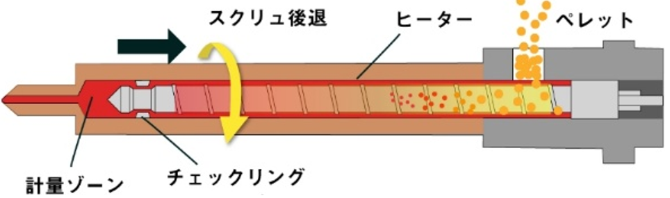 - スクリュー: スクリューが回転しながら後退することで、ヒーターにより溶融した樹脂が、混練されながらスクリュ前方(計量ゾーン)に流れ込みます。